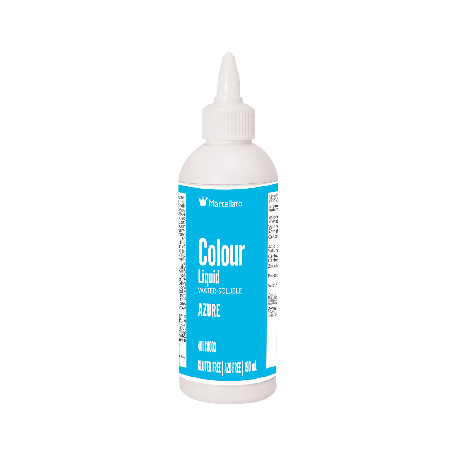 Ready-to-use water-soluble liquid dye, light blue color. Suitable for use with airbrush. Also ideal for mass coloring of sponge cake, cream, custard, jelly, almond paste, marzipan and beverages in general.