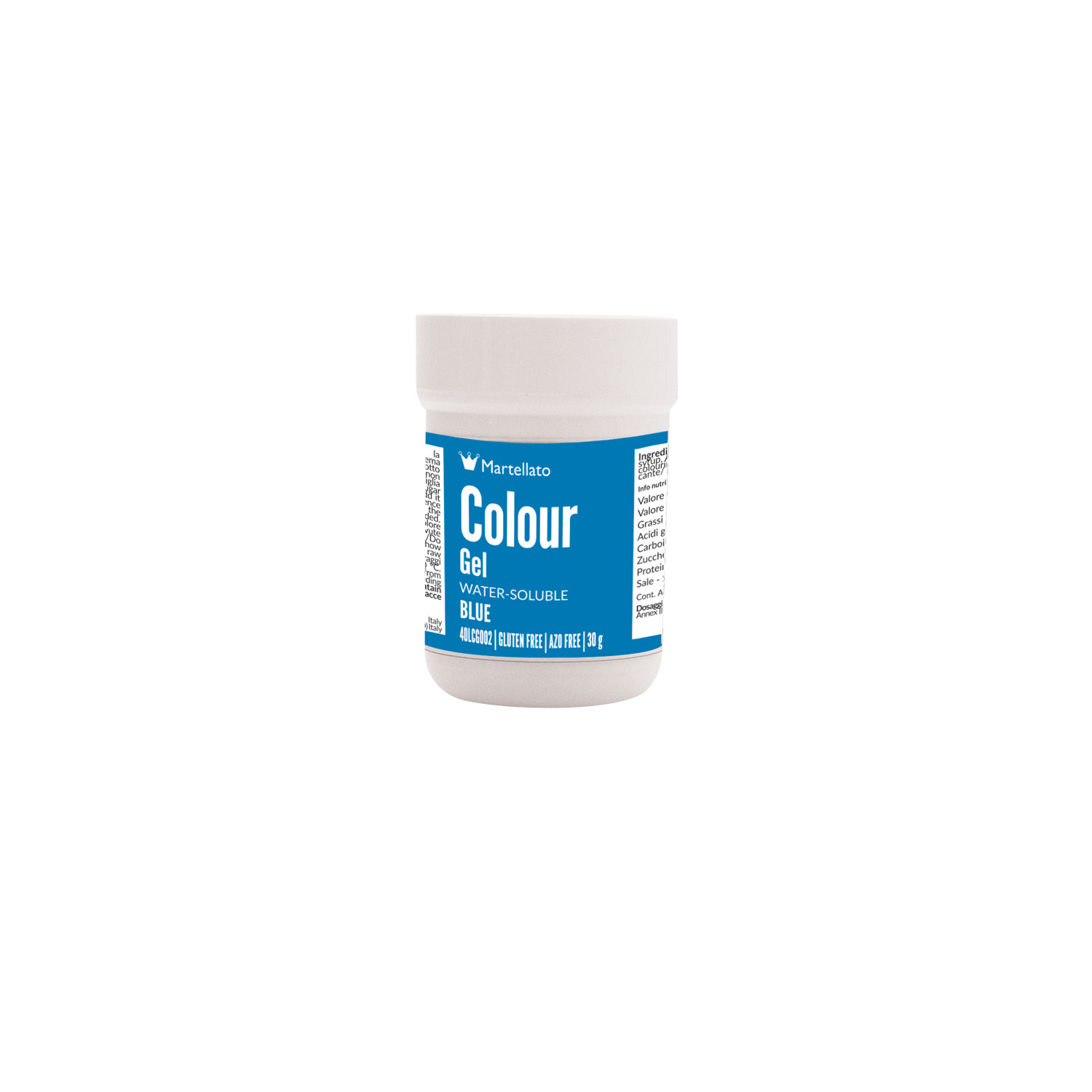 Concentrated water-soluble gel dye, blue color. Ideal for bulk decoration of all water-based products or emulsions such as sugar paste, cream, buttercream, icing and various doughs such as cookies and meringues.