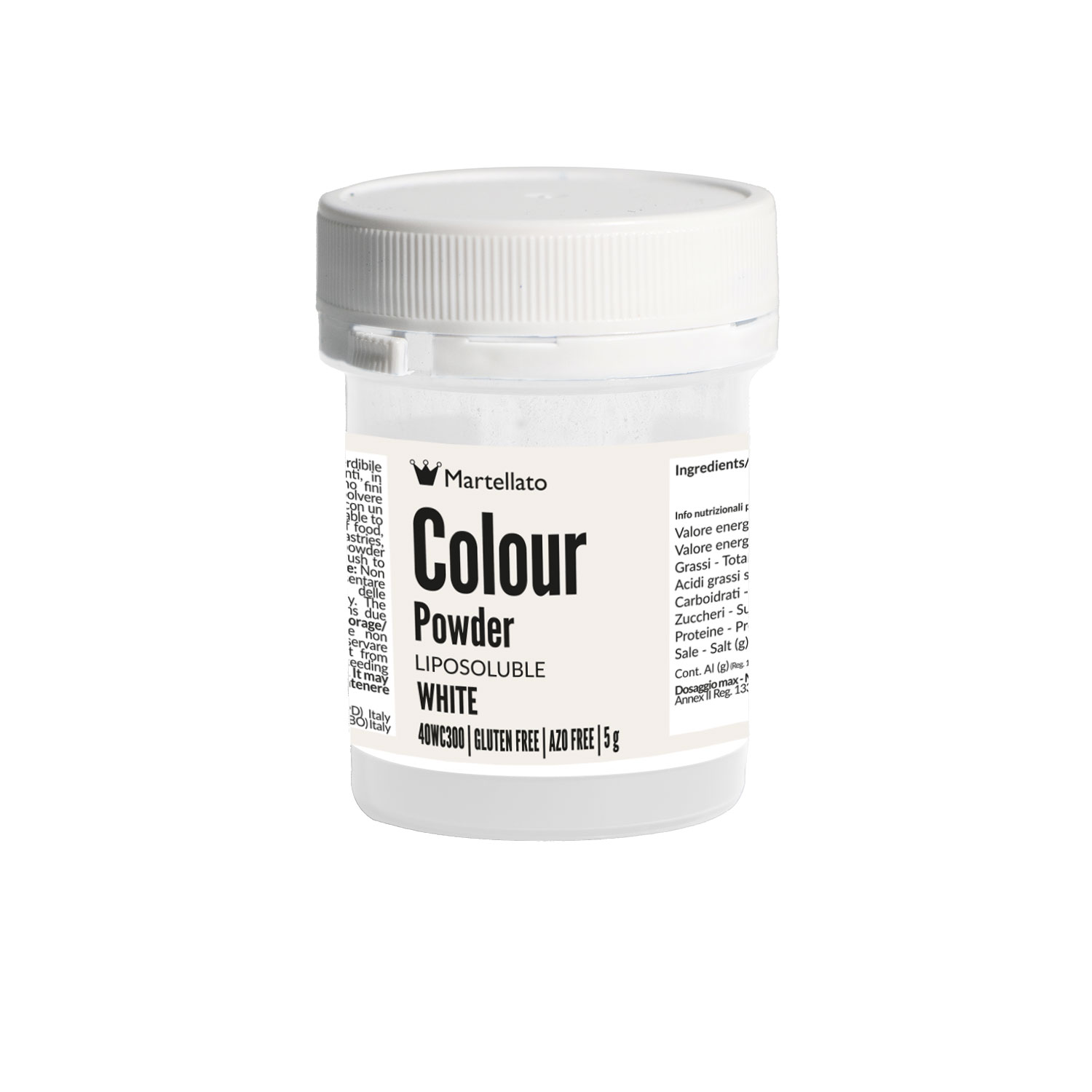 White fat-soluble powder dye suitable for mass coloring of fat-based products such as, cocoa butter, white chocolate, buttercream, almond paste, sugar paste, parfaits. It can be used on the surface with a brush as is, diluted with alcohol or liquid shellac and then brushed directly onto the surface you wish to decorate.