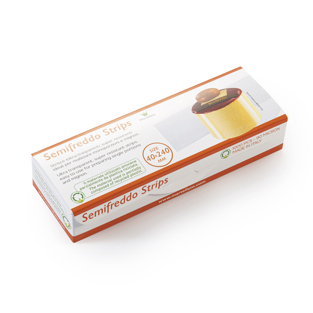 Food-grade acetate strips in various sizes. Our acetate strip is easy to use for lining molds and for making and unmolding single-portion and mignons because of its nonstick properties. It is suitable for chilling in blast chiller, freezer and refrigerator and is extra transparent, super durable and made from high quality material.