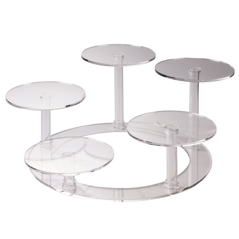 Plexiglass cake stand with 5 plates 26cm diameter. Ideal for setting up refined buffets for ceremonies and business meetings or simply for displaying your creations inside your venue. The elements that compose it are interchangeable to create ever-changing games of heights and proportions.