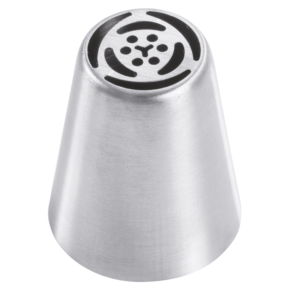Stainless steel nozzle for sac à poche or pastry bag with elaborate floral shape. This nozzle is seamless, guaranteeing even product discharge and high strength. Pack of 5 pieces. The measurements refer to the outlet hole and the height to the overall height of the nozzle.