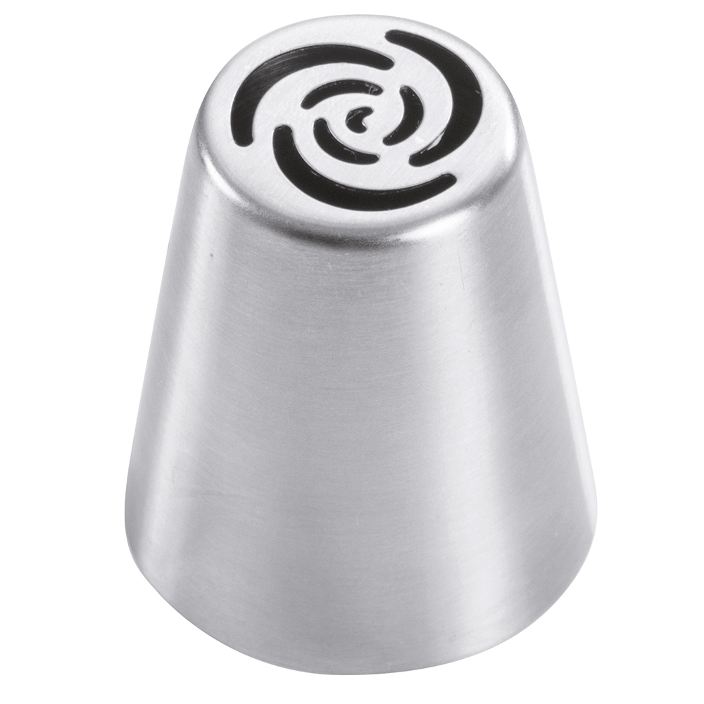 Stainless steel nozzle for sac à poche or pastry bag with elaborate floral shape. This nozzle is seamless, guaranteeing even product discharge and high strength. Pack of 5 pieces. The measurements refer to the outlet hole and the height to the overall height of the nozzle.