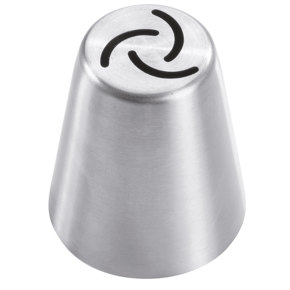 Stainless steel nozzle for sac à poche or pastry bag with elaborate floral shape. This nozzle is seamless, guaranteeing even product discharge and high strength. Pack of 5 pieces. The measurements refer to the outlet hole and the height to the overall height of the nozzle.