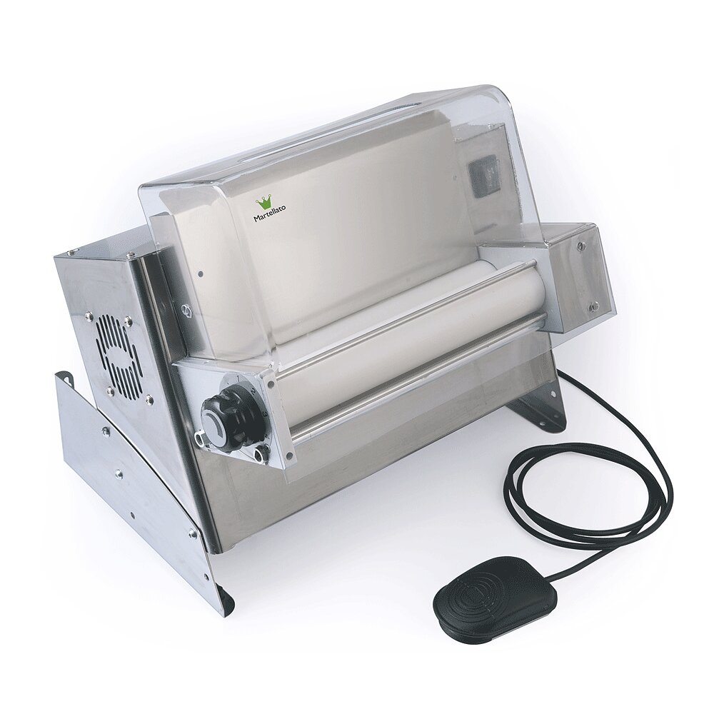 Professional dough rolling machine with 50cm roller. Designed and built to solve the problems of forming disks for the preparation of pizza, bread, focaccia, pies, etc.. The professional dough stretcher with 50cm teflon roller works cold and does not alter the characteristics of the dough, allowing also the processing of sugar. It also has a transparent plexiglass roller guard for maximum safety without altering visibility and a knob for adjusting the thickness ranging from 1 to 4mm.